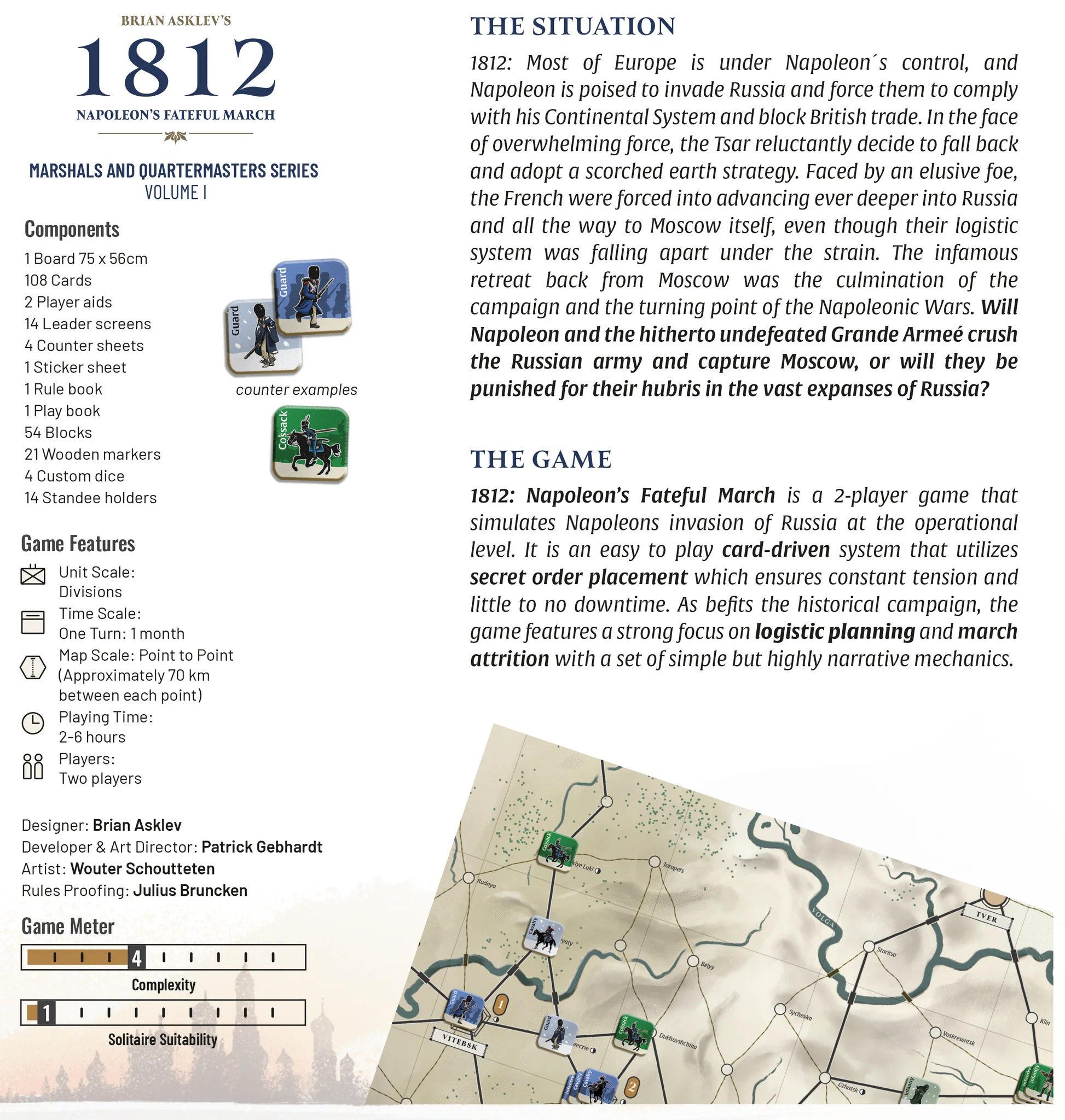 secret order placement which ensures constant tension and little to no downtime. As befits the historical campaign, the game features a strong focus on logistic planning and march attrition with a set of simple but highly narrative mechanics.