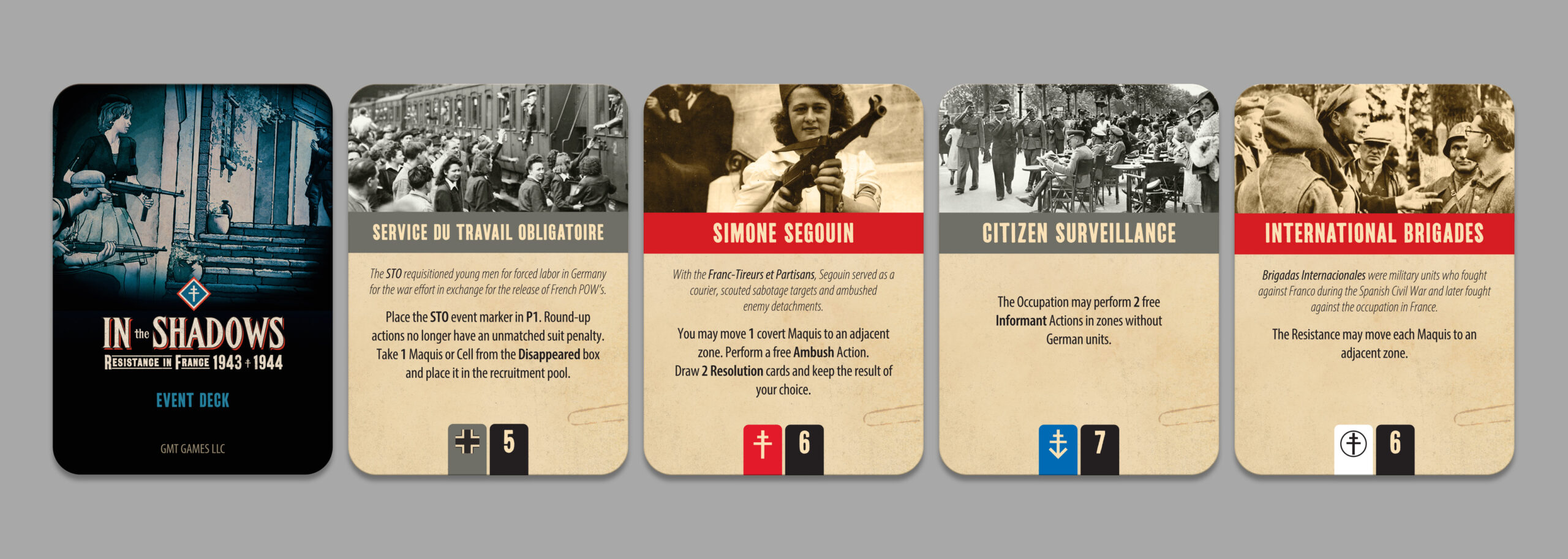In the Shadows is a two-player card-driven game about the desperate struggle of the French Resistance against the occupying Nazi and collaborating French forces between January 1943 and June 1944. In the game you will play as either the Resistance or the Occupation in a fight over the hearts and minds of the French People. The game strives to have players better understand the nuances of the resistance and the clandestine nature of the fight that led to the founding of the fourth French Republic.