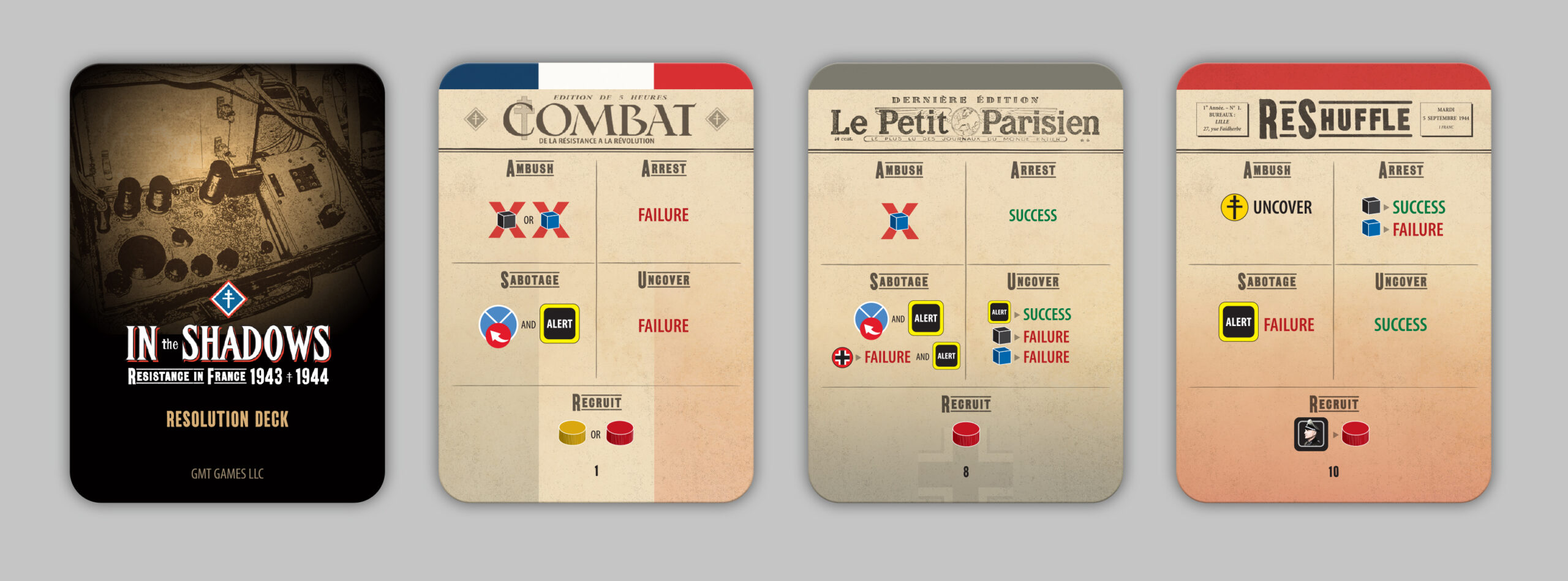 In the Shadows also uses a Resolution deck in lieu of dice. Represented as newspapers, a vital line of communication for the Resistance, these cards allow players to resolve an action with the flip of a card. This unique system allows for a streamlined game that lets players focus more on strategy and less on luck, making for a compelling and quick-playing gaming experience.